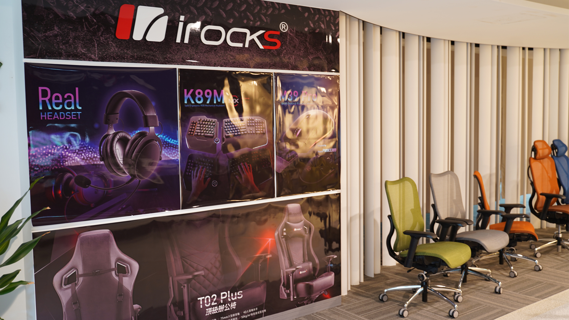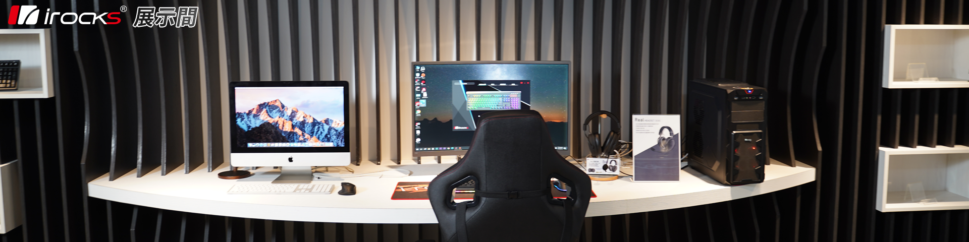 iRocks是台灣以自有品牌,不斷投注創新精神與研發及行銷努力,提供完善及附加價值的電腦週邊產品,新北展示中心提供iRocks新品鍵盤、滑鼠、耳機等商品,可供各位現場體驗!
