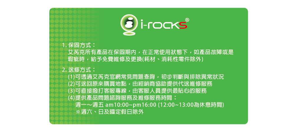 感謝您選購i-Rocks艾芮克,商品於購買日起皆享有保固