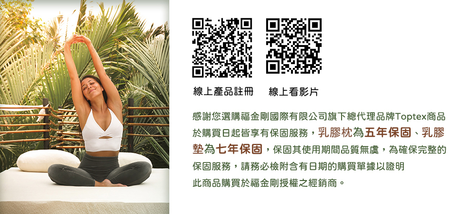 感謝您選購福金剛國際有限公司旗下品牌Toptex,商品於購買日起皆享有保固服務,乳膠枕為五年保固、乳膠墊為七年保固,保固其使用期間品質無虞,為確保完整的保固服務,請務必檢附含有日期的購買單據以證明此商品購買於福金剛授權之經銷商。