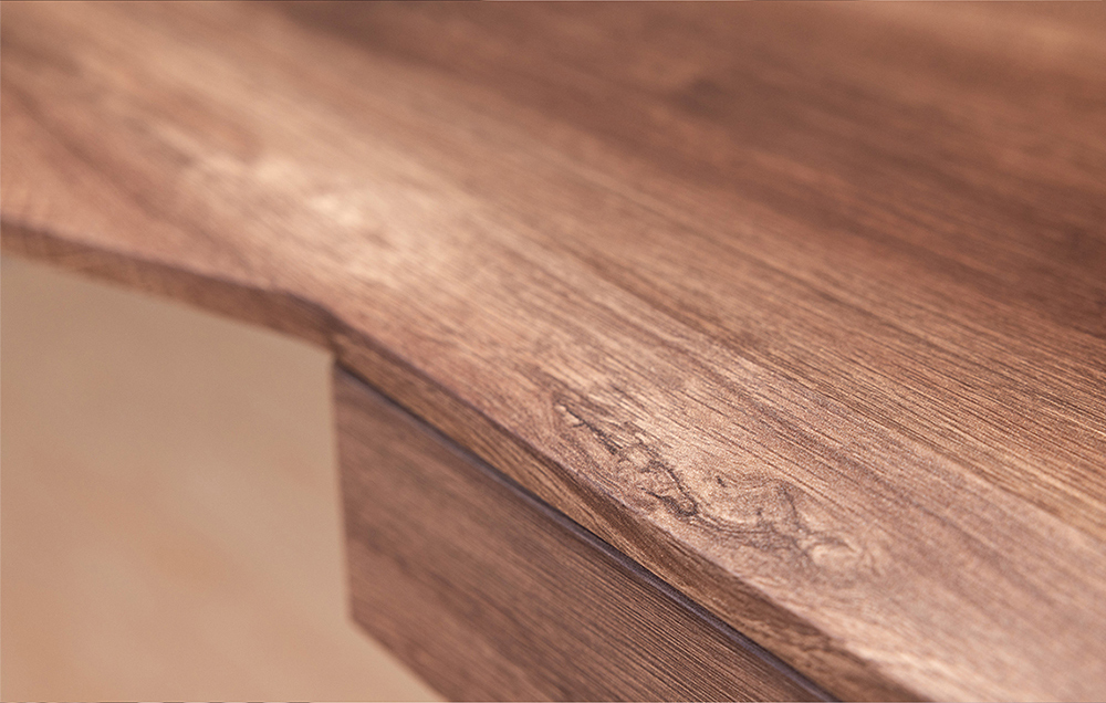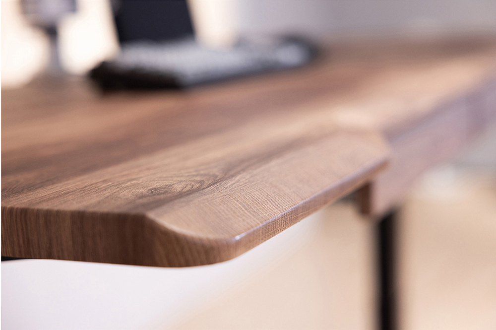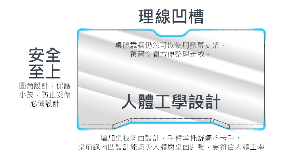 人體工學內凹桌板設計、四邊導圓角+前緣斜切面不刮手