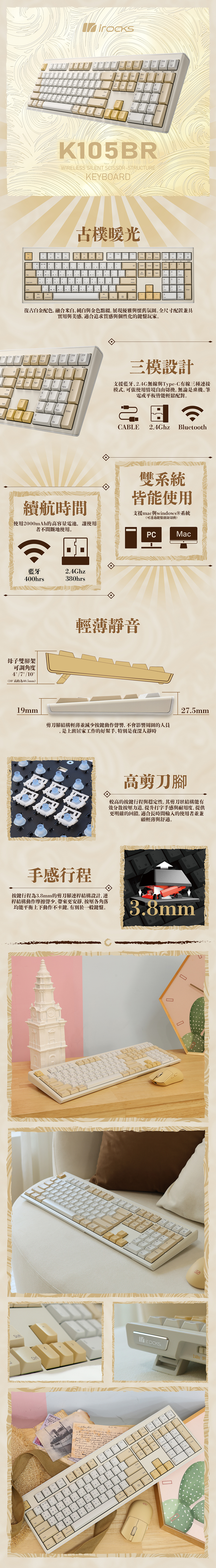 irocks K105BR 無線三模藍牙剪刀腳 靜音鍵盤 - 亞麻晨光