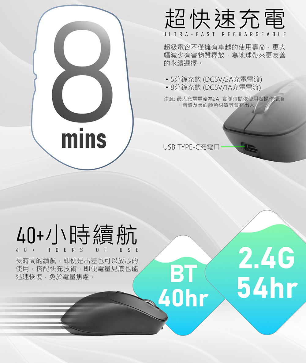 l 充電快速,8分鐘充飽,可連續使用約40多小時