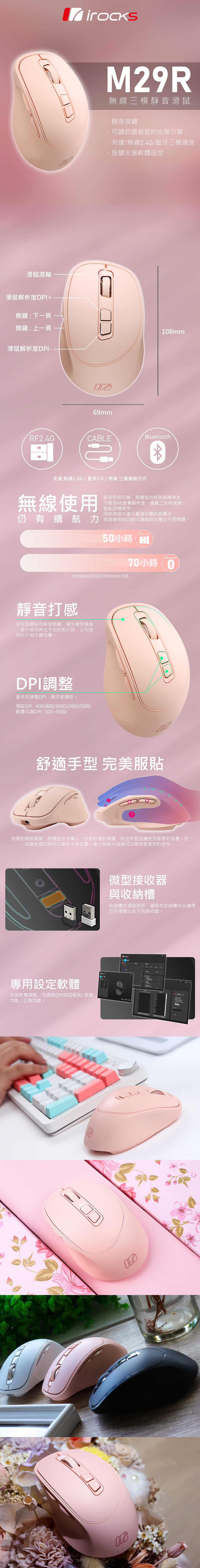iRocks M29R 藍牙無線三模 光學靜音滑鼠 -粉色