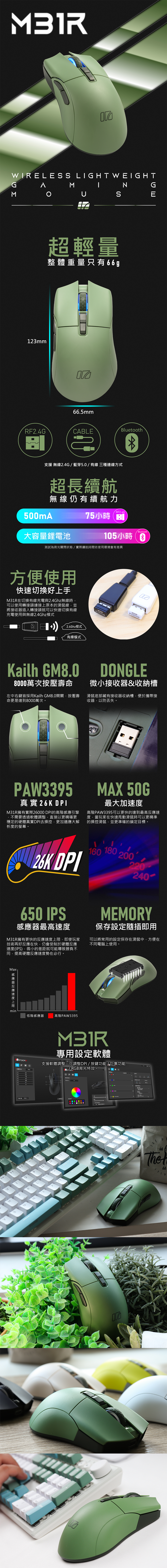 iRocks M31R 藍芽 無線 三模 光學 輕量化 電競 滑鼠 英倫綠