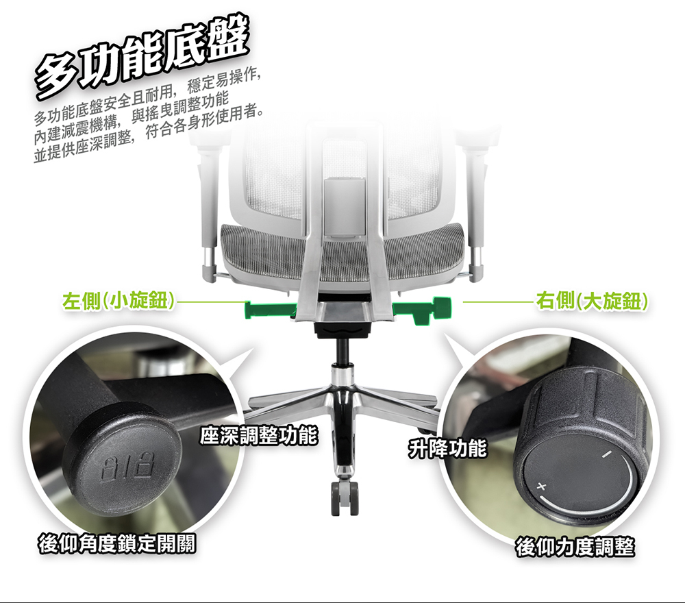 •可調整椅座座深 : 有,底盤操控前後調整。