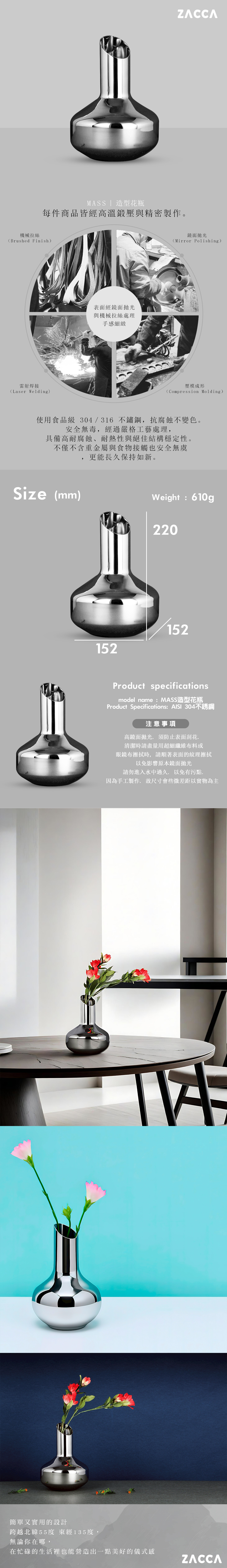 本款不鏽鋼花瓶融合鏡面拋光質感與手工塑形的流線輪廓,