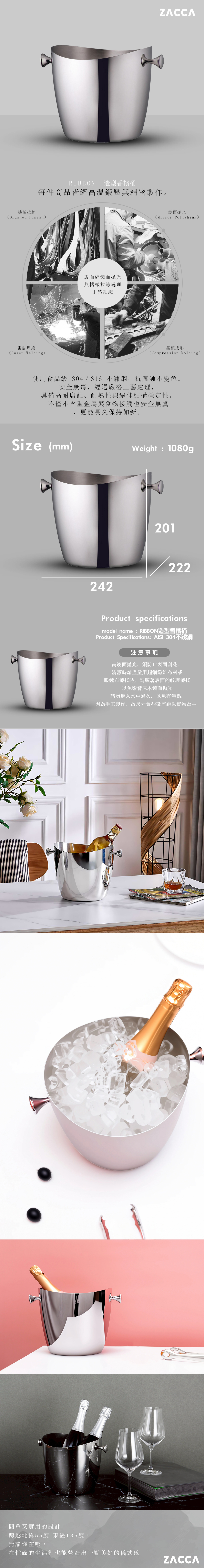 本款不鏽鋼香檳桶融合鏡面拋光質感與手工塑形的流線輪廓,